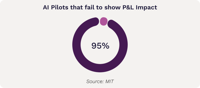 Some people might think this means the AI doesn’t work, but that’s actually not the prevailing issue. For example, MIT’s study of generative AI pilots defines success as delivering “measurable P&L value”, which only 5% of generative AI pilots in the study achieved. That’s astounding and notable, but it’s not the same as the tech itself not working. It’s actually a classic problem we see over and over again in internal tech projects. I’m going to be talking about AI tools, but this really isn’t any different than any other technology transformation initiative. You could replace 'AI' with any other enterprise tech initiative and these same dynamics apply.
