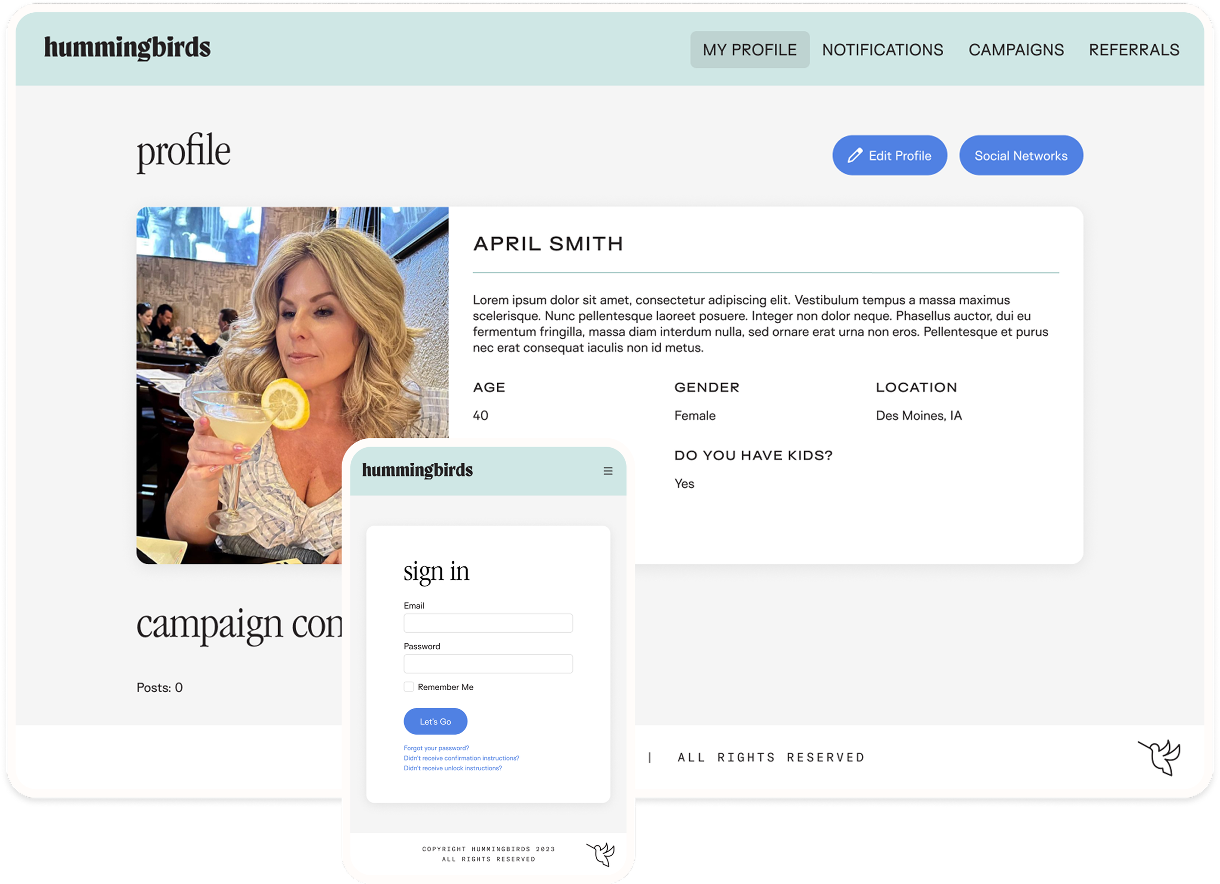 Cofounders Emily Steele and Charise Flynn came to us with a bootstrapped MVP product and a vision to scale. Hummingbirds needed to support three audiences: the creators (known as hummingbirds), the brands who work with them, and the team at Hummingbirds HQ who supervises the campaigns and ensures both creators and brands are happy.