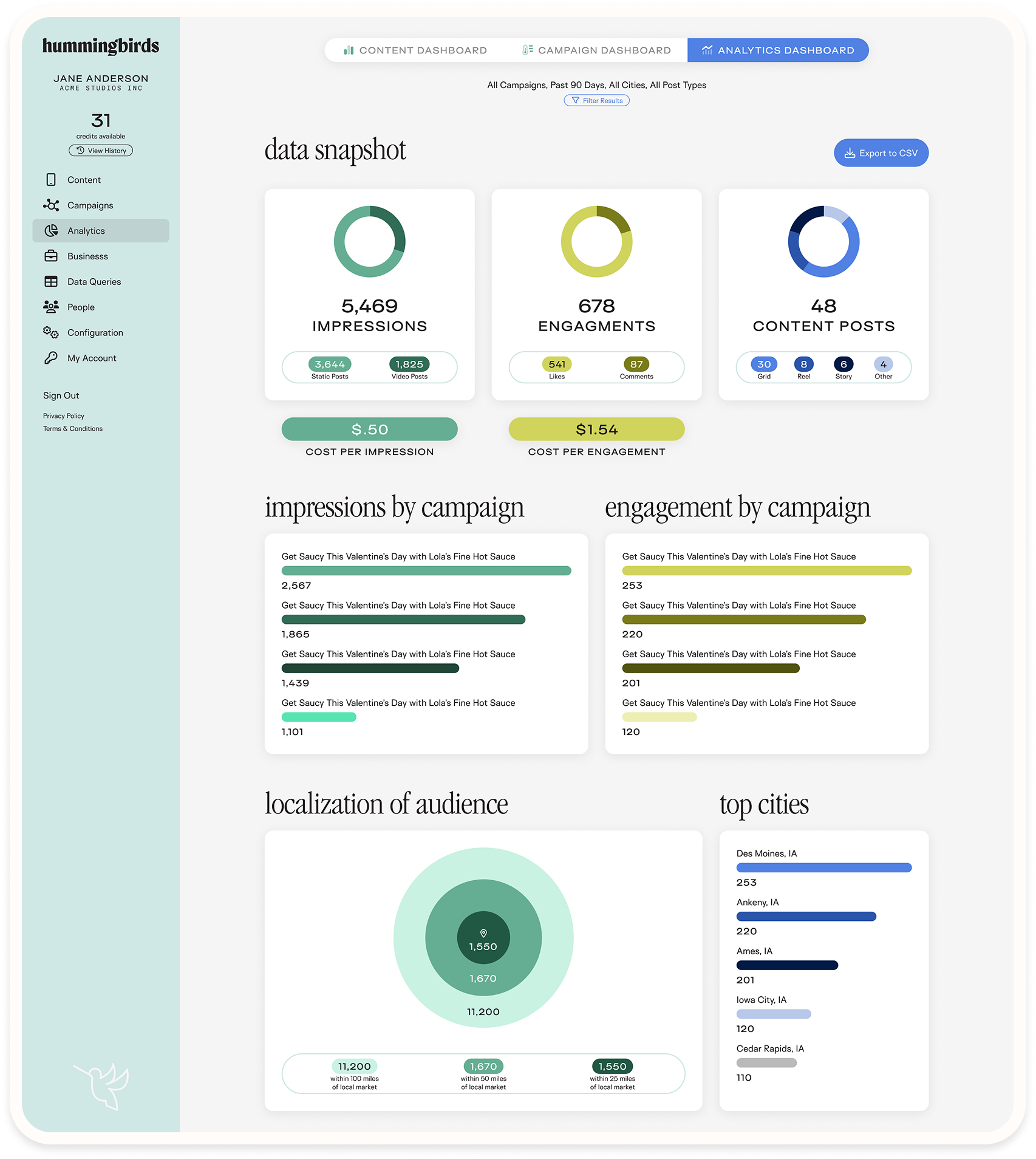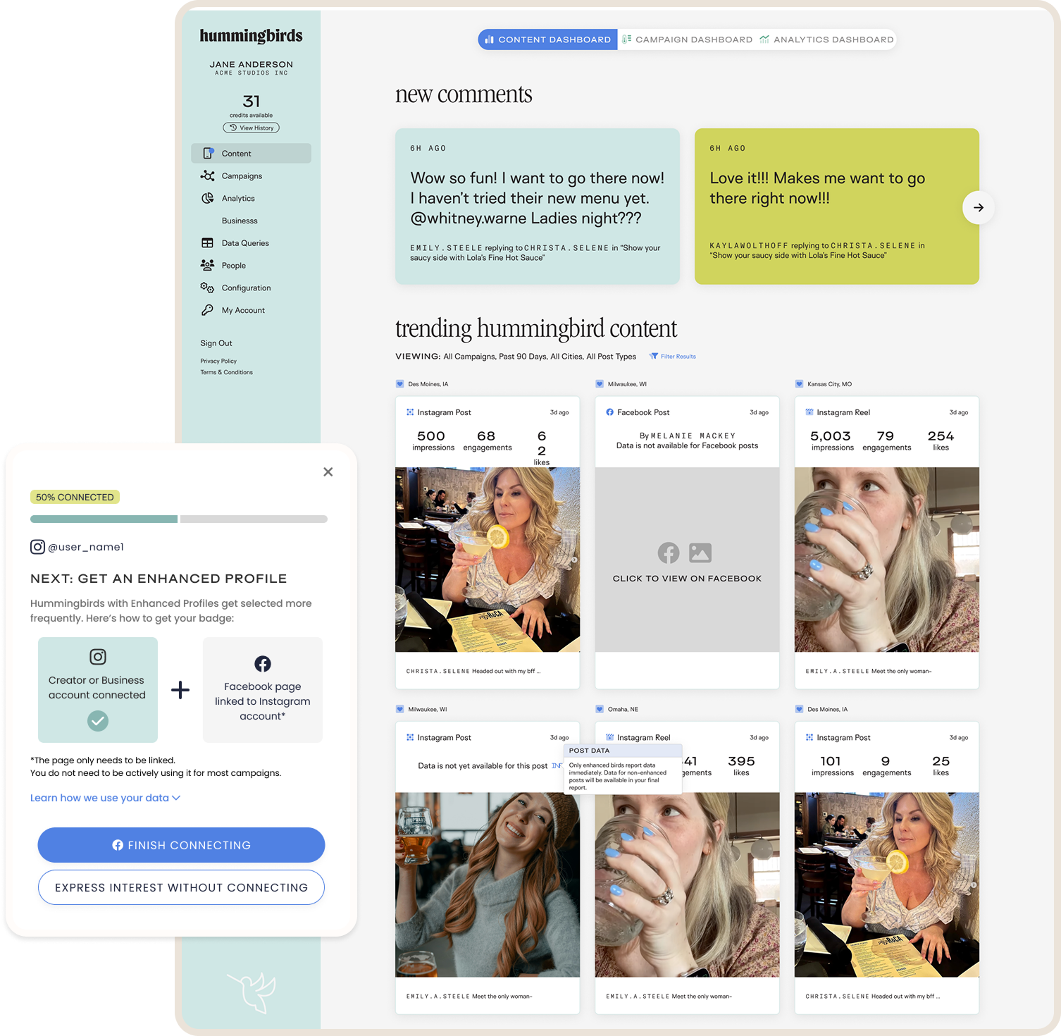 We integrated the platform with Meta to pull content and statistics from Instagram. This was a critical component—post content and engagement data are central to proving Hummingbirds’ value, so we needed a way to automatically retrieve that data in real time.